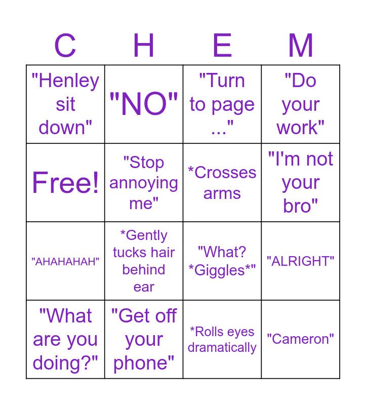 This bingo card has 16 words: "Get off your phone", "ALRIGHT", "Turn to page ...", "Henley sit down", "AHAHAHAH", "NO", "What?*Giggles*", *Rolls eyes dramatically, Free!, "Stop annoying me", "What are you doing?", "Do your work", *Gently tucks hair behind ear, "I'm not your bro", *Crosses arms and "Cameron".
