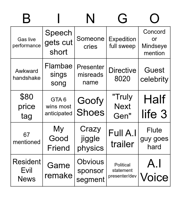 This bingo card has a free space and 24 words: My Good Friend, Game remake, Presenter misreads name, Resident Evil News, Concord or Mindseye mention, Gas live performance, Awkward handshake, Speech gets cut short, "Truly Next Gen", Crazy jiggle physics, Directive 8020, $80 price tag, Full A.I trailer, Flute guy goes hard, Flambae sings song, Political statement presenter/dev, Half life 3, Someone cries, Guest celebrity, GTA 6 wins most anticipated, A.I Voice, 67 mentioned, Expedition full sweep and Obvious sponsor segment.