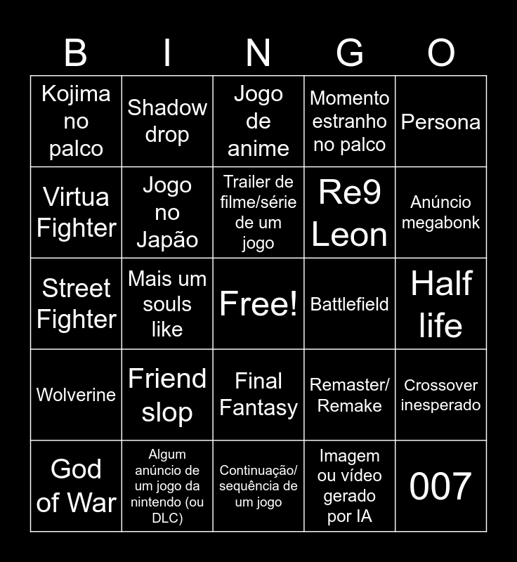 This bingo card has a free space and 24 words: God of War, Friend slop, Trailer de filme/série de um jogo, Imagem ou vídeo gerado por IA, Persona, Kojima no palco, Shadow drop, Jogo de anime, Battlefield, Half life, Street Fighter, Jogo no Japão, Remaster/ Remake, Crossover inesperado, Virtua Fighter, Algum anúncio de um jogo da nintendo (ou DLC), Continuação/ sequência de um jogo, Momento estranho no palco, Anúncio megabonk, Wolverine, Mais um souls like, Final Fantasy, Re9 Leon and 007.