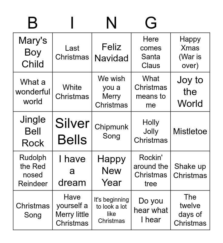 This bingo card has 43 words: All I want for Christmas, Chipmunk Song, Christmas Is my Favourite time of the Year, Christmas Song, Do they know its Christmas, Do you hear what I hear, Feliz Navidad, Frosty the Snowman, Happy Xmas (War is over), Have yourself a Merry little Christmas, Here comes Santa Claus, Holly Jolly Christmas, Happy New Year, I have a dream, I'll be home for Christmas, It's beginning to look a lot like Christmas, It's the most wonderful time of the Year, Jingle Bell Rock, Jingle Bells, Joy to the World, Last Christmas, Let it Snow!, Little Drummer Boy, Mary's Boy Child, Merry Christmas Everyone, Mistletoe, Mistletoe and Wine, O come all ye Faithful, Rockin' around the Christmas tree, Rudolph the Red nosed Reindeer, Santa Claus is comin' to town, Shake up Christmas, Silent Night, Silver Bells, Step into Christmas, The First Noel, The twelve days of Christmas, We wish you a Merry Christmas, What a wonderful world, What Christmas means to me, When a child is born, White Christmas and Winter Wonderland.