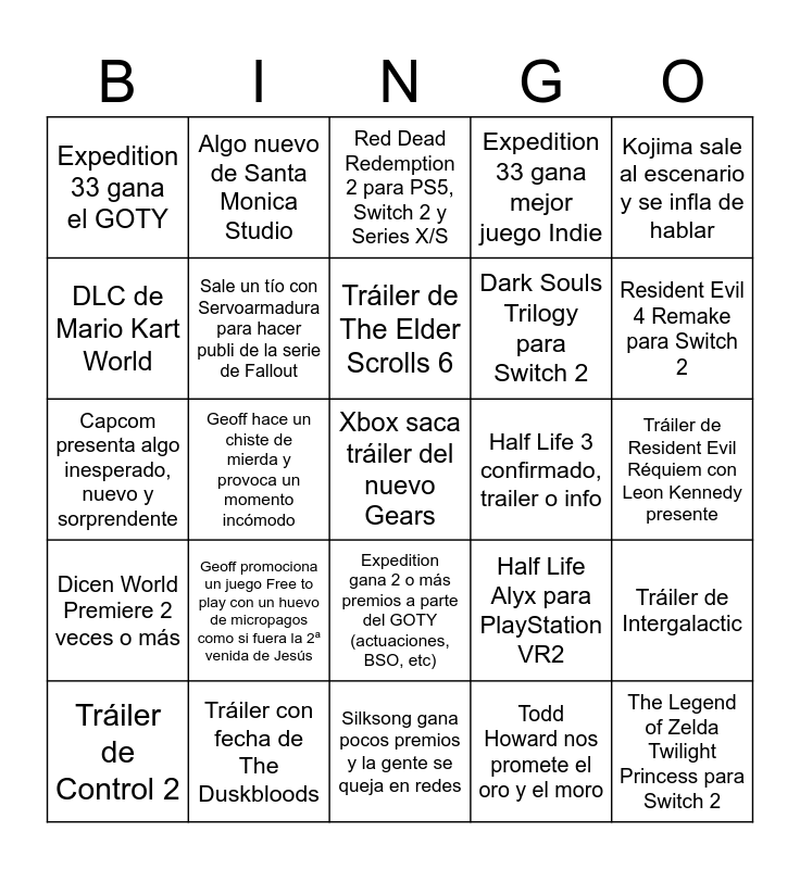 This bingo card has a free space and 24 words: Geoff promociona un juego Free to play con un huevo de micropagos como si fuera la 2ª venida de Jesús, Tráiler con fecha de The Duskbloods, Tráiler de The Elder Scrolls 6, Tráiler de Control 2, Kojima sale al escenario y se infla de hablar, Expedition 33 gana el GOTY, DLC de Mario Kart World, Algo nuevo de Santa Monica Studio, Half Life 3 confirmado, trailer o info, Expedition gana 2 o más premios a parte del GOTY (actuaciones, BSO, etc), Dark Souls Trilogy para Switch 2, Capcom presenta algo inesperado, nuevo y sorprendente, Half Life Alyx para PlayStation VR2, Tráiler de Intergalactic, Sale un tío con Servoarmadura para hacer publi de la serie de Fallout, Todd Howard nos promete el oro y el moro, Tráiler de Resident Evil Réquiem con Leon Kennedy presente, Red Dead Redemption 2 para PS5, Switch 2 y Series X/S, Resident Evil 4 Remake para Switch 2, Geoff hace un chiste de mierda y provoca un momento incómodo, The Legend of Zelda Twilight Princess para Switch 2, Dicen World Premiere 2 veces o más, Expedition 33 gana mejor juego Indie and Silksong gana pocos premios y la gente se queja en redes.