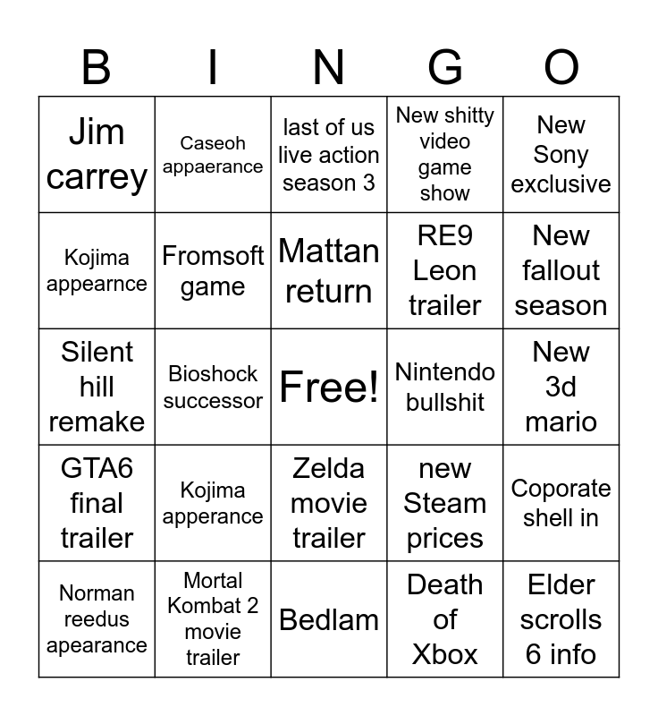 This bingo card has a free space and 24 words: Kojima apperance, Mortal Kombat 2 movie trailer, Mattan return, Norman reedus apearance, New Sony exclusive, Jim carrey, Kojima appearnce, Caseoh appaerance, Nintendo bullshit, Zelda movie trailer, RE9 Leon trailer, Silent hill remake, new Steam prices, Coporate shell in, Fromsoft game, Death of Xbox, New 3d mario, last of us live action season 3, New fallout season, Bioshock successor, Elder scrolls 6 info, GTA6 final trailer, New shitty video game show and Bedlam.