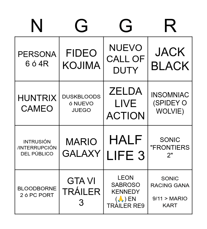 This bingo card has 16 words: GTA VI TRÁILER 3, SONIC "FRONTIERS 2", NUEVO CALL OF DUTY, PERSONA 6 ó 4R, INTRUSIÓN /INTERRUPCIÓN DEL PÚBLICO, FIDEO KOJIMA, HALF LIFE 3, LEON SABROSO KENNEDY (🙏) EN TRÁILER RE9, HUNTRIX CAMEO, DUSKBLOODS ó NUEVO JUEGO, BLOODBORNE 2 ó PC PORT, JACK BLACK, MARIO GALAXY, INSOMNIAC (SPIDEY O WOLVIE), ZELDA LIVE ACTION and SONIC RACING GANA 9/11 > MARIO KART.