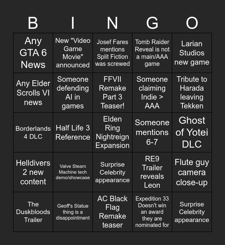 This bingo card has 26 words: Surprise Celebrity appearance, Expedition 33 Doesn't win an award they are nominated for, FFVII Remake Part 3 Teaser!, Geoff's Statue thing is a disappointment, Larian Studios new game, Any GTA 6 News, Any Elder Scrolls VI news, New "Video Game Movie" announced, Ghost of Yotei DLC, RE9 Trailer reveals Leon, Someone claiming Indie > AAA, Borderlands 4 DLC, Flute guy camera close-up, The Duskbloods Trailer, Half Life 3 Reference, New God Of War Announced, Tomb Raider Reveal is not a main/AAA game, Helldivers 2 new content, Josef Fares mentions Split Fiction was screwed, Elden Ring Nightreign Expansion, Tribute to Harada leaving Tekken, AC Black Flag Remake teaser, Someone mentions 6-7, Valve Steam Machine tech demo/showcase, Someone defending AI in games and Surprise Celebrity appearance.