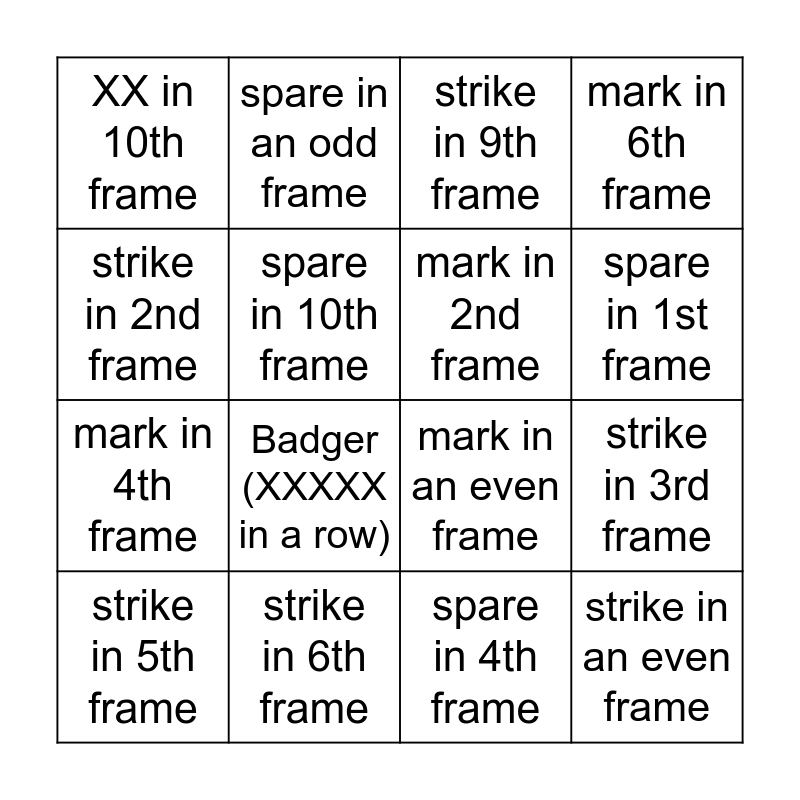 This bingo card has 55 words: Free!, X in 1st frame, X in 10th frame, XX in 10th frame, a Spare, mark in 1st frame, mark in 2nd frame, mark in 3rd frame, mark in 4th frame, mark in 5th frame, mark in 6th frame, mark in 7th frame, mark in 8th frame, mark in 9th frame, mark in 10th frame, strike in 1st frame, strike in 2nd frame, strike in 3rd frame, strike in 4th frame, strike in 5th frame, strike in 6th frame, strike in 7th frame, strike in 8th frame, strike in 9th frame, strike in 10th frame, spare in 1st frame, spare in 2nd frame, spare in 3rd frame, spare in 4th frame, spare in 5th frame, spare in 6th frame, spare in 7th frame, spare in 8th frame, spare in 9th frame, spare in 10th frame, mark in an even frame, mark in an odd frame, strike in an even frame, strike in an odd frame, spare in an even frame, spare in an odd frame, same # of pin standing after 1st ball as the frame #, XX in a row, Turkey (XXX in a row), XXX in the 10th frame, pick up a split, pick up loan 1 pin, pick up loan 5 pin, Win Lucky Duck, Badger (XXXXX in a row), Every team member marks in the same frame, game score is consecutive #'s, game score is 10+ pins over average, mark after a sleeper and pick up the sleeper pin.