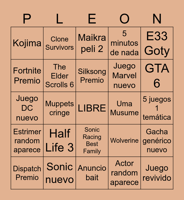This bingo card has a free space and 24 words: Half Life 3, Sonic nuevo, Silksong Premio, Dispatch Premio, E33 Goty, Kojima, Fortnite Premio, Clone Survivors, Uma Musume, Sonic Racing Best Family, Juego Marvel nuevo, Juego DC nuevo, Wolverine, Gacha genérico nuevo, The Elder Scrolls 6, Actor random aparece, 5 juegos 1 temática, Maikra peli 2, GTA 6, Muppets cringe, Juego revivido, Estrimer random aparece, 5 minutos de nada and Anuncio bait.