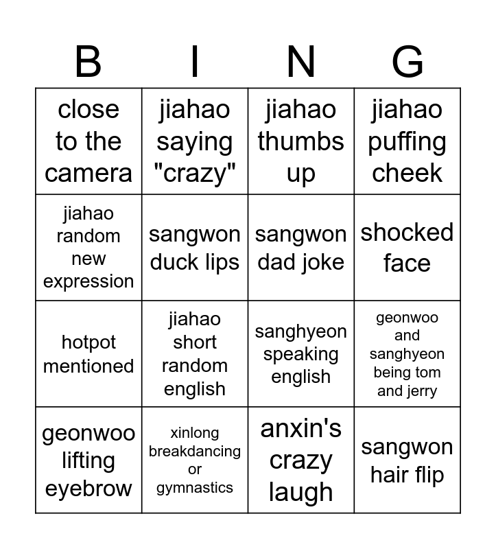 This bingo card has 16 words: xinlong breakdancing or gymnastics, geonwoo and sanghyeon being tom and jerry, jiahao thumbs up, close to the camera, hotpot mentioned, jiahao saying "crazy", sanghyeon speaking english, anxin's crazy laugh, jiahao random new expression, sangwon duck lips, geonwoo lifting eyebrow, jiahao puffing cheek, jiahao short random english, shocked face, sangwon dad joke and sangwon hair flip.