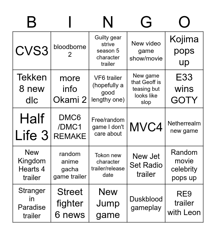 This bingo card has a free space and 24 words: random anime gacha game trailer, Street fighter 6 news, VF6 trailer (hopefully a good lengthy one), Stranger in Paradise trailer, Kojima pops up, CVS3, Tekken 8 new dlc, bloodborne 2, MVC4, Tokon new character trailer/release date, New game that Geoff is teasing but looks like slop, Half Life 3, New Jet Set Radio trailer, Random movie celebrity pops up, more info Okami 2, Duskblood gameplay, Netherrealm new game, Guilty gear strive season 5 character trailer, E33 wins GOTY, DMC6 /DMC1 REMAKE, RE9 trailer with Leon, New Kingdom Hearts 4 trailer, New video game show/movie and New Jump game.