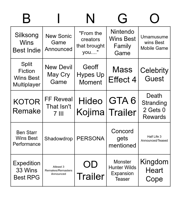 This bingo card has a free space and 24 words: Shadowdrop, Atleast 3 Remakes/Remasters Announced, Geoff Hypes Up Moment, Expedition 33 Wins Best RPG, Umamusume wins Best Mobile Game, Silksong Wins Best Indie, Split Fiction Wins Best Multiplayer, New Sonic Game Announced, GTA 6 Trailer, PERSONA, Mass Effect 4, KOTOR Remake, Concord gets mentioned, Half Life 3 Announced/Teased, New Devil May Cry Game, Monster Hunter Wilds Expansion Teaser, Death Stranding 2 Gets 0 Rewards, "From the creators that brought you....", Celebrity Guest, FF Reveal That Isn't 7 III, Kingdom Heart Cope, Ben Starr Wins Best Performance, Nintendo Wins Best Family Game and OD Trailer.