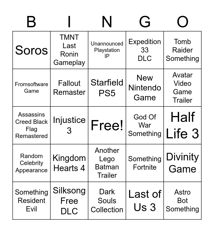 This bingo card has a free space and 24 words: Kingdom Hearts 4, Silksong Free DLC, Starfield PS5, Something Resident Evil, Tomb Raider Something, Soros, Fromsoftware Game, TMNT Last Ronin Gameplay, God Of War Something, Another Lego Batman Trailer, New Nintendo Game, Assassins Creed Black Flag Remastered, Something Fortnite, Divinity Game, Fallout Remaster, Last of Us 3, Half Life 3, Unannounced Playstation IP, Avatar Video Game Trailer, Injustice 3, Astro Bot Something, Random Celebrity Appearance, Expedition 33 DLC and Dark Souls Collection.