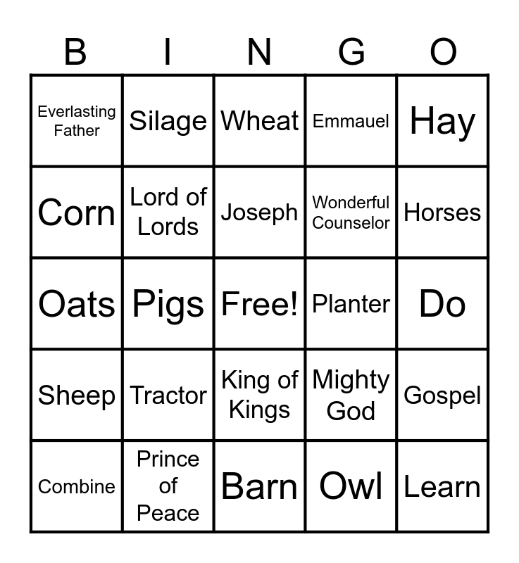 This bingo card has a free space and 39 words: FFA, Noel, Mary, Lord of Lords, Combine, King of Kings, Joseph, Gold, Hay, Sheep, Pigs, Emmauel, Learn, Do, Planter, Tractor, Live, Everlasting Father, Rye, Mighty God, Corn, Barn, Wonderful Counselor, Horses, Jesus, Cows, Rice, Blue, Plow, Silage, Goats, Serve, Wheat, Prince of Peace, Owl, Bale, Gospel, Oats and Straw.