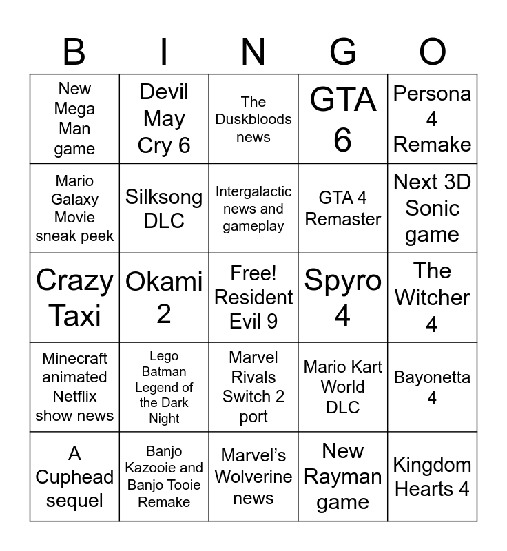 This bingo card has a free space and 24 words: Lego Batman Legend of the Dark Night, Banjo Kazooie and Banjo Tooie Remake, Intergalactic news and gameplay, A Cuphead sequel, Persona 4 Remake, New Mega Man game, Mario Galaxy Movie sneak peek, Devil May Cry 6, Spyro 4, Marvel Rivals Switch 2 port, GTA 4 Remaster, Crazy Taxi, Mario Kart World DLC, Bayonetta 4, Silksong DLC, New Rayman game, The Witcher 4, The Duskbloods news, Next 3D Sonic game, Okami 2, Kingdom Hearts 4, Minecraft animated Netflix show news, GTA 6 and Marvel’s Wolverine news.