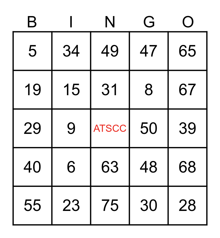 This bingo card has a free space and 24 words: 6, 23, 31, 55, 65, 5, 19, 34, 50, 63, 8, 29, 48, 68, 15, 30, 39, 49, 67, 9, 28, 40, 47 and 75.