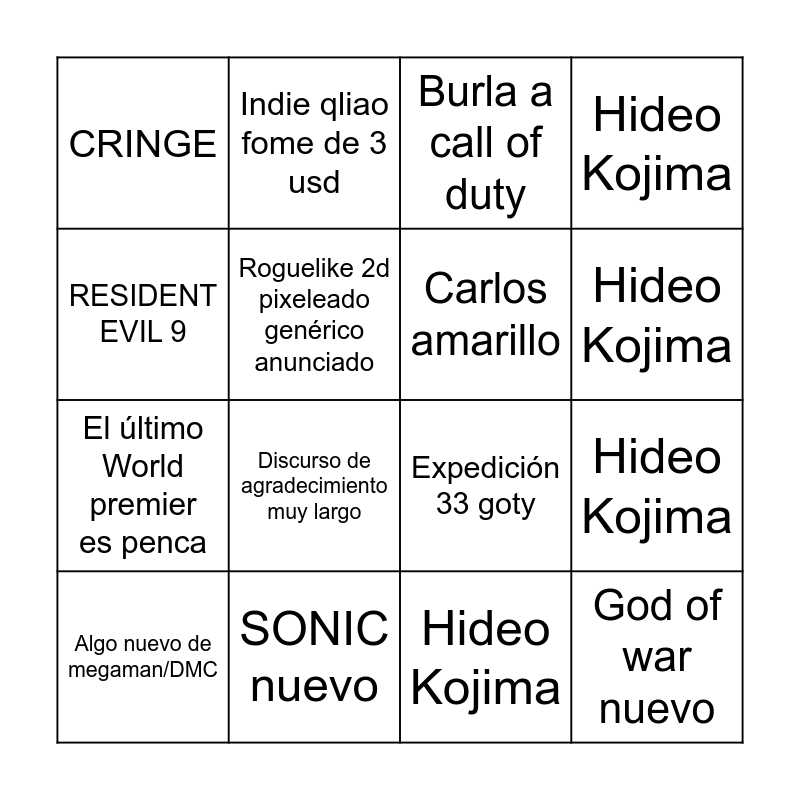 This bingo card has 20 words: Hideo Kojima, Otro DLC de Balatro, Burla a call of duty, DLC silksong, Algo nuevo de megaman/DMC, RESIDENT EVIL 9, SONIC nuevo, CRINGE, El último World premier es penca, Indie qliao fome de 3 usd, Discurso de agradecimiento muy largo, Expedición 33 goty, Roguelike 2d pixeleado genérico anunciado, God of war nuevo, Carlos amarillo, Lol no se que más poner, Hideo Kojima, Hideo Kojima, Hideo Kojima and Hideo Kojima.