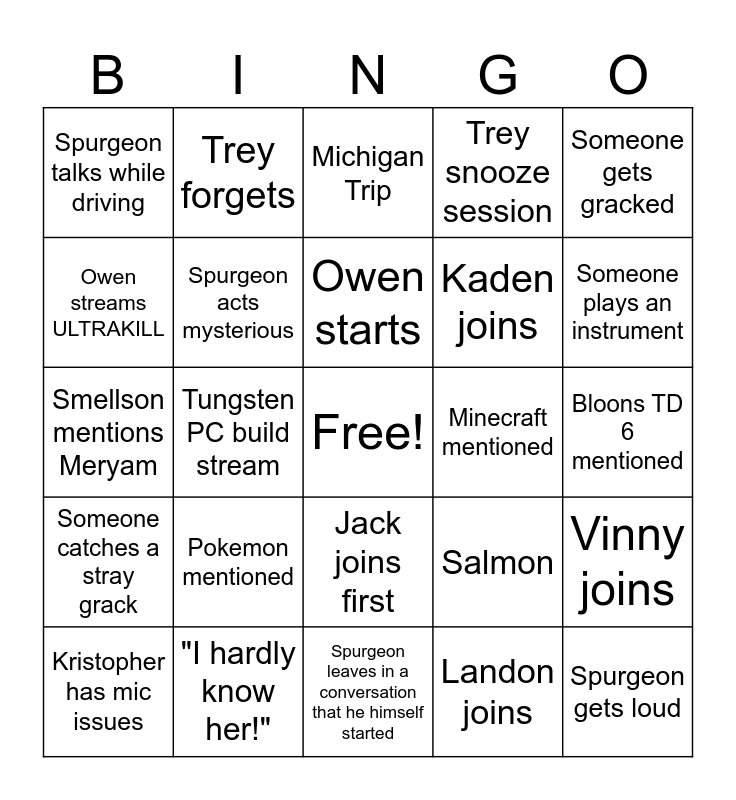 This bingo card has a free space and 40 words: Kristopher gets bullied, Smellson mentions Meryam, Spurgeon mentions Analyse, Spurgeon acts mysterious, "I hardly know her!", Jack joins first, Owen starts, Bryce queues Albuquerque, Someone gets gracked, Someone catches a stray grack, Tungsten PC build stream, Trey snooze session, Spurgeon gets loud, Bloons TD 6 mentioned, Minecraft mentioned, Pokemon mentioned, Story from 2 years ago, Spurgeon talks while driving, Bryce Roblox stream, Michigan Trip, Vinny joins, Landon joins, Kaden joins, Owen streams ULTRAKILL, Wordle, Horsle, Spungo uses soundboard, Someone calls Nero "The Clanker", Somone actually uses Fetty WAP, Bryce has mic issues, Nelson has mic issues, Kristopher has mic issues, Fih mentioned, Salmon, Someone plays an instrument, Spurgeon leaves in a conversation that he himself started, Trey Gossips, Owen notices something very obvious, Trey forgets and Rhode Island Gnomes.