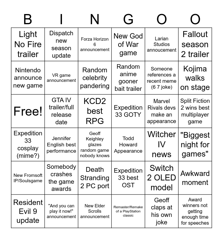 This bingo card has 36 words: Expedition 33 best OST, Death Stranding 2 PC port, Remaster/Remake of a PlayStation classic, Nintendo announce new game, Expedition 33 cosplay (mime?), Expedition 33 GOTY, VR game announcement, New Elder Scrolls announcement, Larian Studios annoucement, Switch 2 OLED model, Kojima walks on stage, New God of War game, Awkward moment, GTA IV trailer/full release date, Random anime gooner bait trailer, Light No Fire trailer, New Fromsoft IP/Soulsgame, Marvel Rivals devs make an appearance, Free!, Forza Horizon 6 announcement, KCD2 best RPG, Jennifer English best performance, Todd Howard Appearance, Geoff Keighley glazes random game nobody knows, Witcher IV news, Dispatch new season update, Someone references a recent meme (6 7 joke), "And you can play it now!" announcement, Random celebrity pandering, Fallout season 2 trailer, Award winners not getting enough time for speeches, Resident Evil 9 update, "Biggest night for games", Split Fiction 2 wins best multiplayer game, Somebody crashes the game awards and Geoff claps at his own joke.