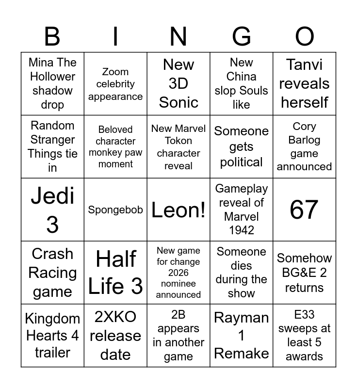 This bingo card has a free space and 24 words: Kingdom Hearts 4 trailer, Half Life 3, New Marvel Tokon character reveal, Rayman 1 Remake, Tanvi reveals herself, Mina The Hollower shadow drop, Zoom celebrity appearance, New 3D Sonic, Gameplay reveal of Marvel 1942, 67, Jedi 3, Beloved character monkey paw moment, Someone dies during the show, Somehow BG&E 2 returns, Random Stranger Things tie in, 2XKO release date, 2B appears in another game, New China slop Souls like, Cory Barlog game announced, Crash Racing game, Spongebob, New game for change 2026 nominee announced, Someone gets political and E33 sweeps at least 5 awards.