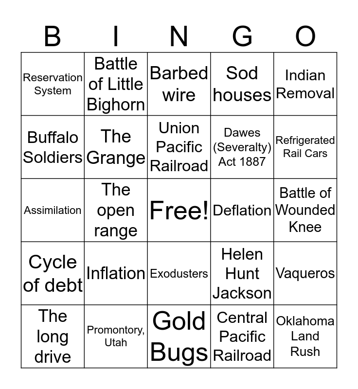 This bingo card has a free space and 26 words: Exodusters, Central Pacific Railroad, Union Pacific Railroad, Promontory, Utah, Indian Removal, Reservation System, Buffalo Soldiers, Battle of Little Bighorn, Battle of Wounded Knee, Helen Hunt Jackson, Dawes (Severalty) Act 1887, Assimilation, Vaqueros, The long drive, The open range, Cow towns, Sod houses, Cycle of debt, Barbed wire, Oklahoma Land Rush, Refrigerated Rail Cars, Gold Bugs, Deflation, Inflation, The Grange and The Omaha Platform.