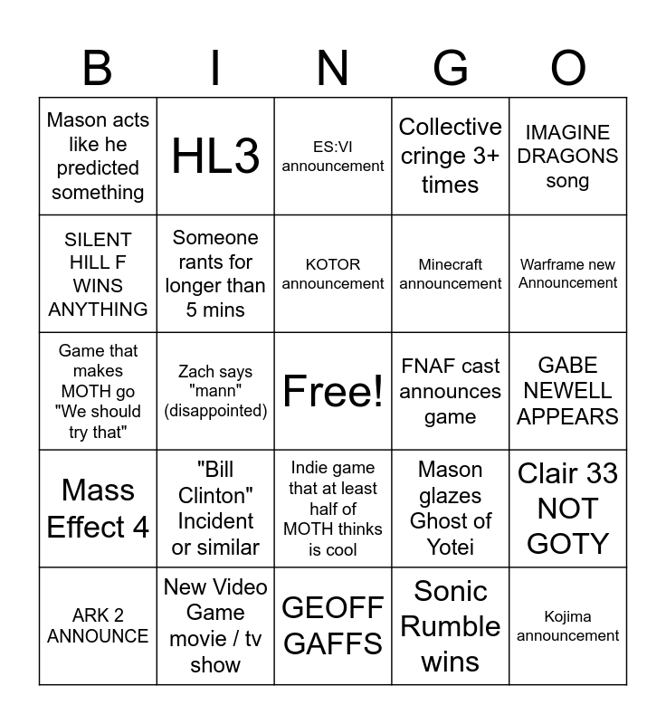 This bingo card has a free space and 24 words: "Bill Clinton" Incident or similar, New Video Game movie / tv show, KOTOR announcement, ARK 2 ANNOUNCE, IMAGINE DRAGONS song, Mason acts like he predicted something, SILENT HILL F WINS ANYTHING, HL3, FNAF cast announces game, Indie game that at least half of MOTH thinks is cool, Minecraft announcement, Game that makes MOTH go "We should try that", Mason glazes Ghost of Yotei, Clair 33 NOT GOTY, Someone rants for longer than 5 mins, Sonic Rumble wins, GABE NEWELL APPEARS, ES:VI announcement, Warframe new Announcement, Zach says "mann" (disappointed), Kojima announcement, Mass Effect 4, Collective cringe 3+ times and GEOFF GAFFS.