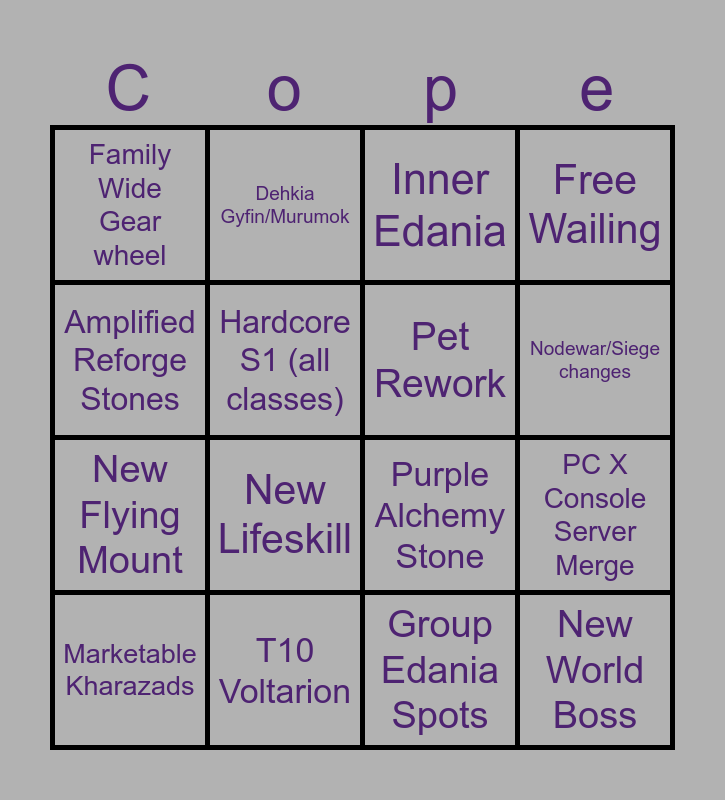 This bingo card has 16 words: T10 Voltarion, PC X Console Server Merge, Inner Edania, Family Wide Gear wheel, New Flying Mount, Dehkia Gyfin/Murumok, Purple Alchemy Stone, Group Edania Spots, Amplified Reforge Stones, Hardcore S1 (all classes), Marketable Kharazads, Free Wailing, New Lifeskill, Nodewar/Siege changes, Pet Rework and New World Boss.