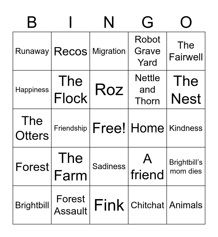 This bingo card has a free space and 24 words: The Farm, Forest Assault, Roz, Brightbill, The Fairwell, Runaway, Happiness, Recos, Home, Sadiness, Nettle and Thorn, The Otters, A friend, Brightbill’s mom dies, The Flock, Chitchat, Kindness, Migration, The Nest, Friendship, Animals, Forest, Robot Grave Yard and Fink.