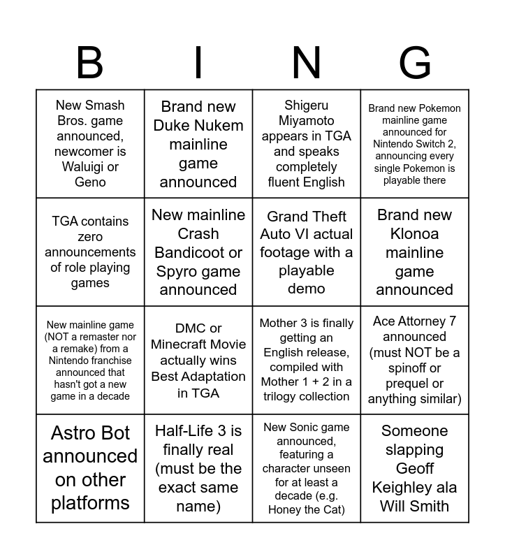 This bingo card has 16 words: Half-Life 3 is finally real (must be the exact same name), Ace Attorney 7 announced (must NOT be a spinoff or prequel or anything similar), Shigeru Miyamoto appears in TGA and speaks completely fluent English, New Smash Bros. game announced, newcomer is Waluigi or Geno, New mainline game (NOT a remaster nor a remake) from a Nintendo franchise announced that hasn't got a new game in a decade, Brand new Duke Nukem mainline game announced, Mother 3 is finally getting an English release, compiled with Mother 1 + 2 in a trilogy collection, New Sonic game announced, featuring a character unseen for at least a decade (e.g. Honey the Cat), TGA contains zero announcements of role playing games, New mainline Crash Bandicoot or Spyro game announced, Astro Bot announced on other platforms, Brand new Pokemon mainline game announced for Nintendo Switch 2, announcing every single Pokemon is playable there, DMC or Minecraft Movie actually wins Best Adaptation in TGA, Brand new Klonoa mainline game announced, Grand Theft Auto VI actual footage with a playable demo and Someone slapping Geoff Keighley ala Will Smith.