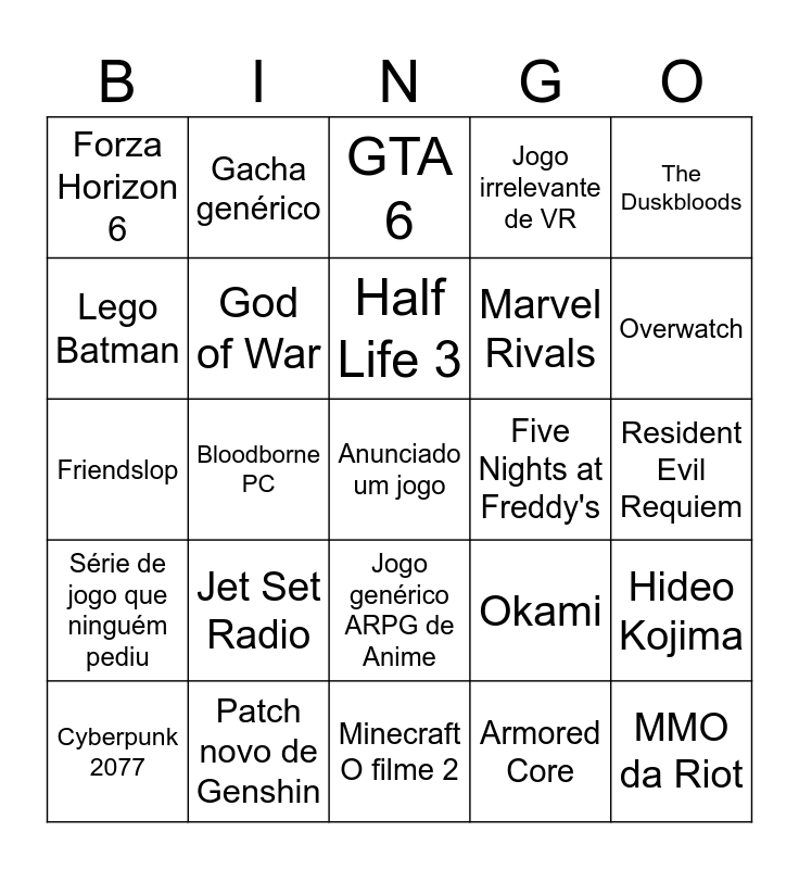 This bingo card has a free space and 24 words: Jet Set Radio, Patch novo de Genshin, Half Life 3, Cyberpunk 2077, The Duskbloods, Forza Horizon 6, Lego Batman, Gacha genérico, Five Nights at Freddy's, Jogo genérico ARPG de Anime, Marvel Rivals, Friendslop, Okami, Hideo Kojima, God of War, Armored Core, Resident Evil Requiem, GTA 6, Overwatch, Bloodborne PC, MMO da Riot, Série de jogo que ninguém pediu, Jogo irrelevante de VR and Minecraft O filme 2.
