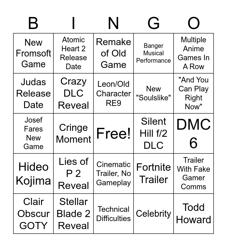 This bingo card has a free space and 24 words: Lies of P 2 Reveal, Stellar Blade 2 Reveal, Leon/Old Character RE9, Clair Obscur GOTY, Multiple Anime Games In A Row, New Fromsoft Game, Judas Release Date, Atomic Heart 2 Release Date, Silent Hill f/2 DLC, Cinematic Trailer, No Gameplay, New "Soulslike", Josef Fares New Game, Fortnite Trailer, Trailer With Fake Gamer Comms, Crazy DLC Reveal, Celebrity, DMC 6, Remake of Old Game, "And You Can Play Right Now", Cringe Moment, Todd Howard, Hideo Kojima, Banger Musical Performance and Technical Difficulties.