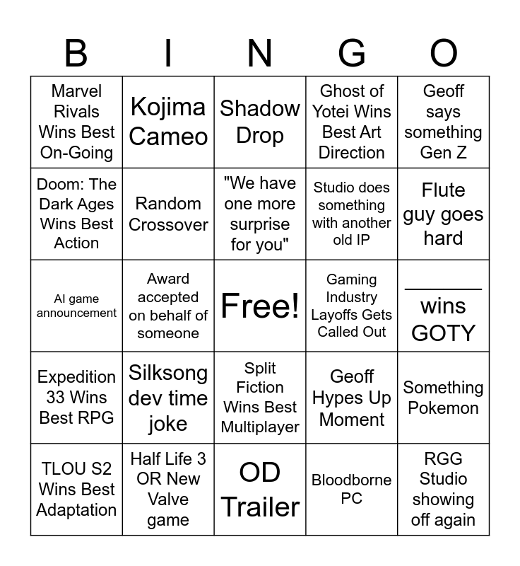 This bingo card has a free space and 54 words: The Hundred Line Wins Best Narrative, Expedition 33 Wins Best RPG, Death Stranding 2 Wins Best Game Direction, Lost Records Wins Games for Impact, Split Fiction Wins Best Multiplayer, AC Shadows Wins Innovation in Accessibility, Ghost of Yotei Wins Best Art Direction, Nintendo Wins Best Family Game, Doom: The Dark Ages Wins Best Action, Ben Starr Wins Best Performance, Marvel Rivals Wins Best On-Going, GTA 6 Wins Most Anticipated Again, Half Life 3 OR New Valve game, TLOU S2 Wins Best Adaptation, GTA 6 Trailer, OD Trailer, RGG Studio showing off again, Studio does something with another old IP, FF7R Part 3 Teaser, ______ wins GOTY, Geoff Hypes Up Moment, Mrs. Piggy joke flops, Gaming Industry Layoffs Gets Called Out, Geoff says something Gen Z, Geoff does something cringey, Kojima Cameo, Wrap it up music before speech ends, WTF celeb announcer, Titanfall 3, Bloodborne PC, Statue Reveal is not Divinity, Statue reveal is Divinity, Halo, TheBurntPeanut wins streamer of the year, Shadow Drop, Meme mention/meme worthy, AI game announcement, Something Pokemon, Jack Black, Random Crossover, Call of Duty jab, New Star Wars Game, Steam Machine mention, Gabe Newell Flops onto stage, Silksong dev time joke, The Expanse RPG trailer, Light No Fire Info, Technical Difficulties, "We have one more surprise for you", Award accepted on behalf of someone, Flute guy goes hard, Post Malone Cameo, RIGGED and Fromsoft game info.