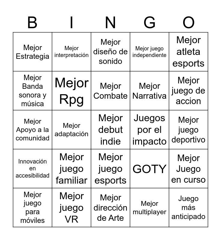 This bingo card has a free space and 27 words: GOTY, Mejor dirección de juego, Mejor Narrativa, Mejor dirección de Arte, Mejor Banda sonora y música, Mejor diseño de sonido, Mejor interpretación, Innovación en accesibilidad, Juegos por el impacto, Mejor Juego en curso, Mejor Apoyo a la comunidad, Mejor juego independiente, Mejor juego para móviles, Mejor juego VR, Mejor juego de accion, Mejor acción aventura, Mejor Rpg, Mejor Combate, Mejor juego familiar, Mejor Estrategia, Mejor juego deportivo, Mejor multiplayer, Mejor adaptación, Juego más anticipado, Mejor juego esports, Mejor atleta esports and Mejor team esports.