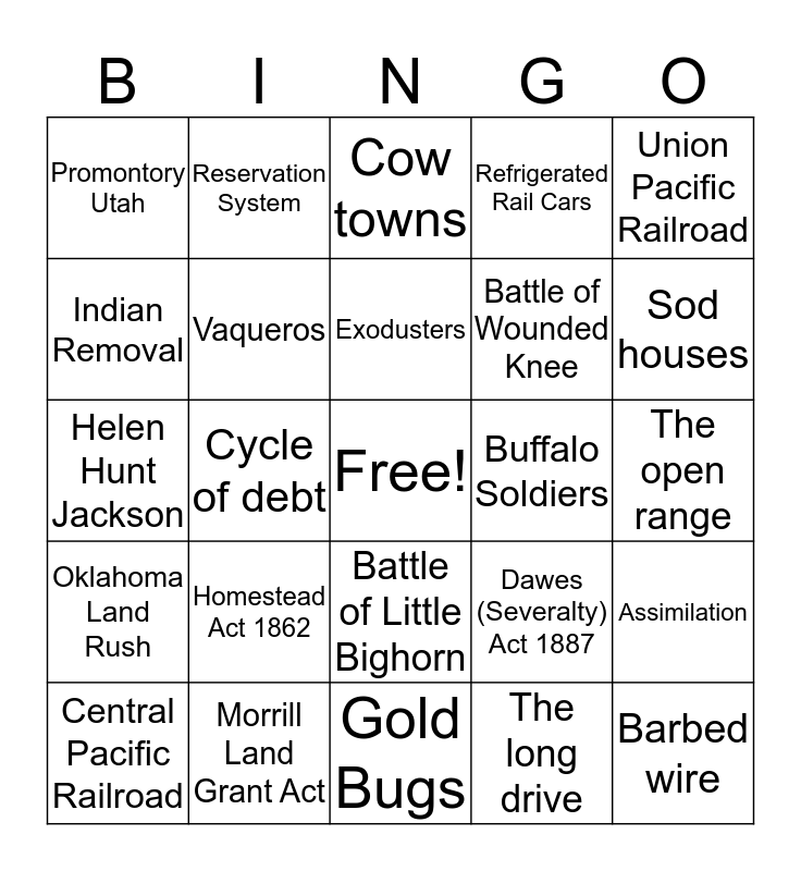 This bingo card has a free space and 24 words: Homestead Act 1862, Morrill Land Grant Act, Exodusters, Central Pacific Railroad, Union Pacific Railroad, Promontory Utah, Indian Removal, Reservation System, Buffalo Soldiers, Battle of Little Bighorn, Battle of Wounded Knee, Helen Hunt Jackson, Dawes (Severalty) Act 1887, Assimilation, Vaqueros, The long drive, The open range, Cow towns, Sod houses, Cycle of debt, Barbed wire, Oklahoma Land Rush, Refrigerated Rail Cars and Gold Bugs.