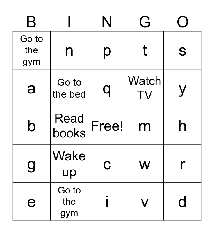 This bingo card has a free space and 24 words: Wake up, Go to the gym, q, e, s, Go to the gym, a, n, m, c, Watch TV, b, w, r, Go to the bed, v, h, p, y, Read books, d, g, t and i.