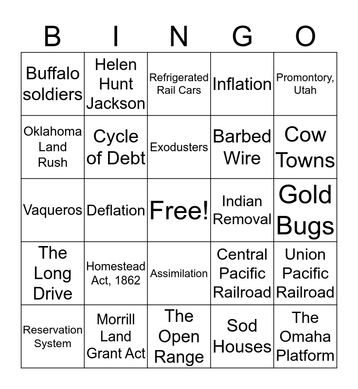 This bingo card has a free space and 24 words: Homestead Act, 1862, Morrill Land Grant Act, Exodusters, Reservation System, Promontory, Utah, Buffalo soldiers, Oklahoma Land Rush, Helen Hunt Jackson, Indian Removal, Assimilation, Barbed Wire, Vaqueros, Central Pacific Railroad, Union Pacific Railroad, Cycle of Debt, Sod Houses, Gold Bugs, Refrigerated Rail Cars, Cow Towns, Deflation, The Omaha Platform, The Long Drive, Inflation and The Open Range.