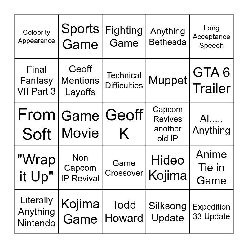 This bingo card has a free space and 24 words: Non Capcom IP Revival, Kojima Game, Technical Difficulties, Literally Anything Nintendo, Long Acceptance Speech, Celebrity Appearance, Final Fantasy VII Part 3, Sports Game, Capcom Revives another old IP, Game Crossover, Muppet, From Soft, Hideo Kojima, Anime Tie in Game, Geoff Mentions Layoffs, Silksong Update, AI..... Anything, Fighting Game, GTA 6 Trailer, Game Movie, Expedition 33 Update, "Wrap it Up", Anything Bethesda and Todd Howard.