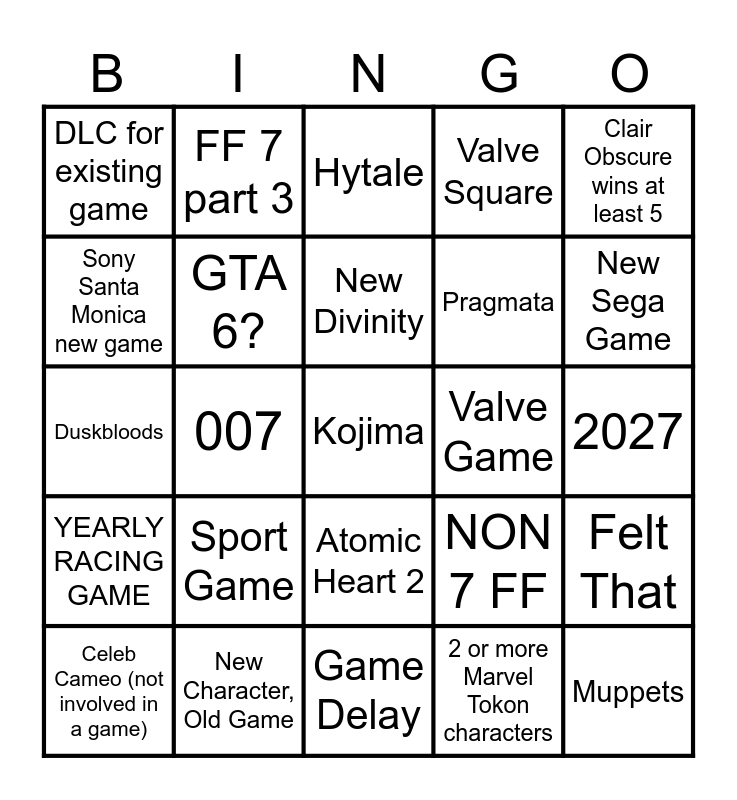This bingo card has a free space and 34 words: Wolverine, 2 or more Marvel Tokon characters, 2XKO character that TR3S likes, LEON!, YEARLY RACING GAME, GTA 6?, Clair Obscure wins at least 5, Celeb Cameo (not involved in a game), FF 7 part 3, MONSTER HUNTER, New Divinity, Hytale, Anything Marvel (Not Tokon or Wolv), Mario Movie, Valve Game, New Sega Game, New Character, Old Game, Duskbloods, Sport Game, NON 7 FF, Atomic Heart 2, Witcher, DLC for existing game, 2027, Game Delay, Muppets, Valve Square, FABLE, Pragmata, Sony Santa Monica new game, Judas, 007, Felt That and COD SLOP.