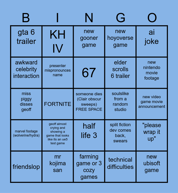 This bingo card has a free space and 24 words: geoff almost crying and showing a game that looks like its an ue5 test game, mr kojima san, 67, friendslop, ai joke, gta 6 trailer, awkward celebrity interaction, KH IV, soulslike from a random studio, half life 3, elder scrolls 6 trailer, miss piggy disses geoff, split fiction dev comes back, swears, "please wrap it up", presenter mispronounces name, technical difficulties, new video game movie announcement, new gooner game, new nintendo movie footage, FORTNITE, new ubisoft game, marvel footage (wolverine/hydra), new hoyoverse game and farming game or 3 cozy games.