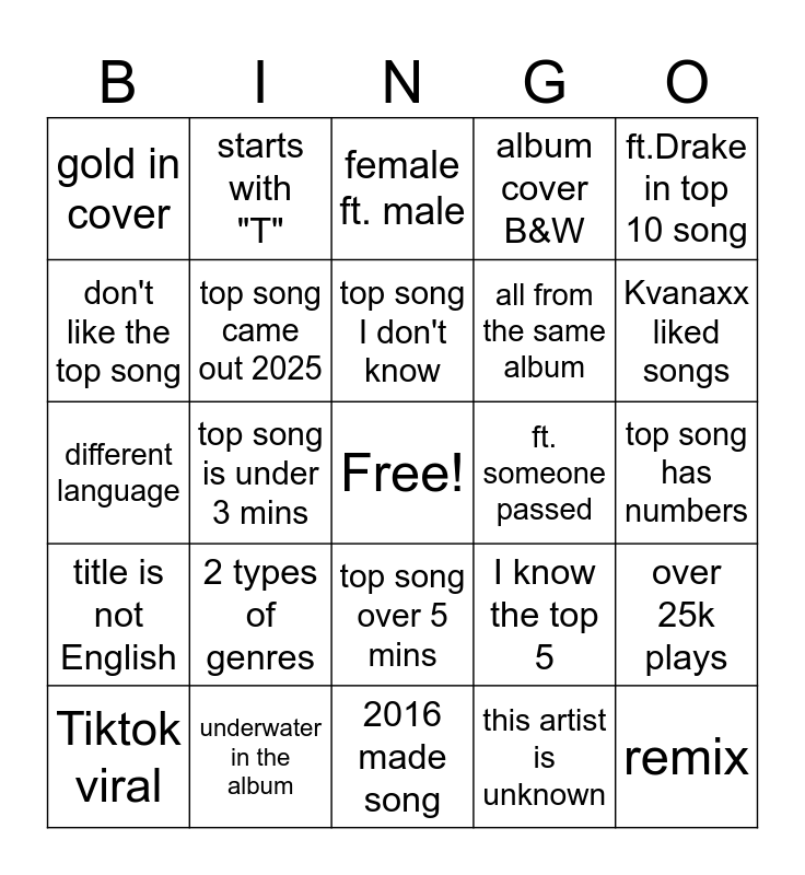 This bingo card has a free space and 24 words: 2 types of genres, underwater in the album, top song I don't know, Tiktok viral, ft.Drake in top 10 song, gold in cover, don't like the top song, starts with "T", ft. someone passed, top song over 5 mins, all from the same album, different language, I know the top 5, over 25k plays, top song came out 2025, this artist is unknown, top song has numbers, female ft. male, Kvanaxx liked songs, top song is under 3 mins, remix, title is not English, album cover B&W and 2016 made song.