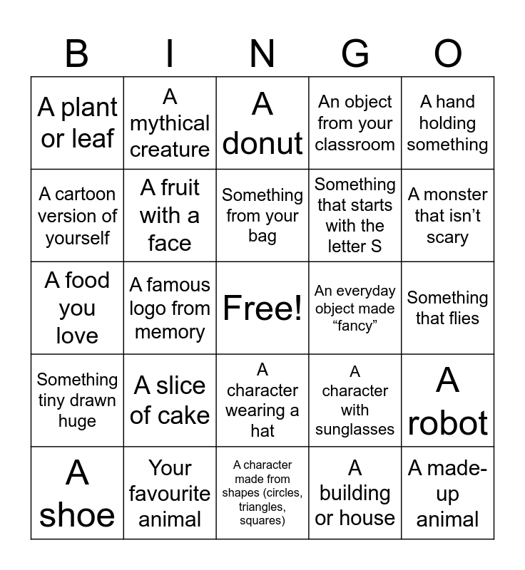 This bingo card has a free space and 24 words: A slice of cake, Your favourite animal, Something from your bag, A shoe, A hand holding something, A plant or leaf, A cartoon version of yourself, A mythical creature, An everyday object made “fancy”, A character wearing a hat, Something that starts with the letter S, A food you love, A character with sunglasses, A robot, A fruit with a face, A building or house, Something that flies, A donut, A monster that isn’t scary, A famous logo from memory, A made-up animal, Something tiny drawn huge, An object from your classroom and A character made from shapes (circles, triangles, squares).