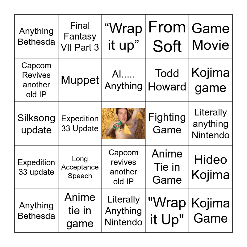 This bingo card has a free space and 48 words: Non Capcom IP Revival, Kojima Game, Technical Difficulties, Literally Anything Nintendo, Long Acceptance Speech, Celebrity Appearance, Final Fantasy VII Part 3, Sports Game, Capcom Revives another old IP, Game Crossover, Muppet, From Soft, Hideo Kojima, Anime Tie in Game, Geoff Mentions Layoffs, Silksong Update, AI..... Anything, Fighting Game, GTA 6 Trailer, Game Movie, Expedition 33 Update, "Wrap it Up", Anything Bethesda, Todd Howard, Hideo kojima, Kojima game, Anything Bethesda, Jeff mentions layoffs, Capcom revives another old IP, Expedition 33 update, GTA 6 trailer, FF VII Part 3, Long acceptance speech, AI..... Anything, Anime tie in game, Celebrity appearance, FromSoft, Literally anything Nintendo, Fighting game, Nom Capcom IP revival, Game movie, Sports game, “Wrap it up”, Game crossover, Silksong update, Todd Howard, Muppet and Technical difficulties.