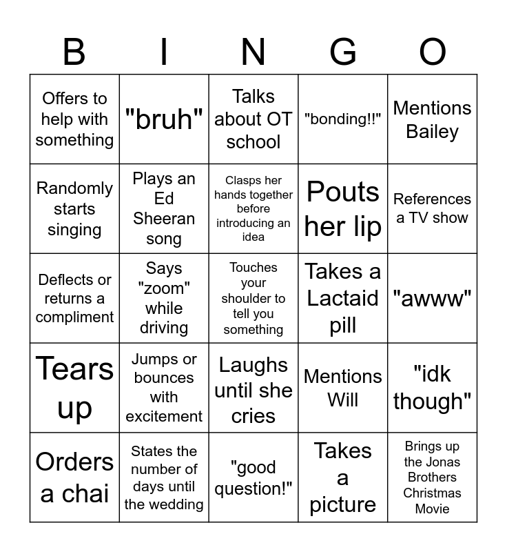 This bingo card has 25 words: Jumps or bounces with excitement, "good question!", Clasps her hands together before introducing an idea, Orders a chai, Mentions Bailey, Offers to help with something, Randomly starts singing, "bruh", Takes a Lactaid pill, Laughs until she cries, Pouts her lip, Deflects or returns a compliment, Mentions Will, "idk though", Plays an Ed Sheeran song, Brings up the Jonas Brothers Christmas Movie, "awww", Talks about OT school, References a TV show, Says "zoom" while driving, Touches your shoulder to tell you something, States the number of days until the wedding, Tears up, "bonding!!" and Takes a picture.