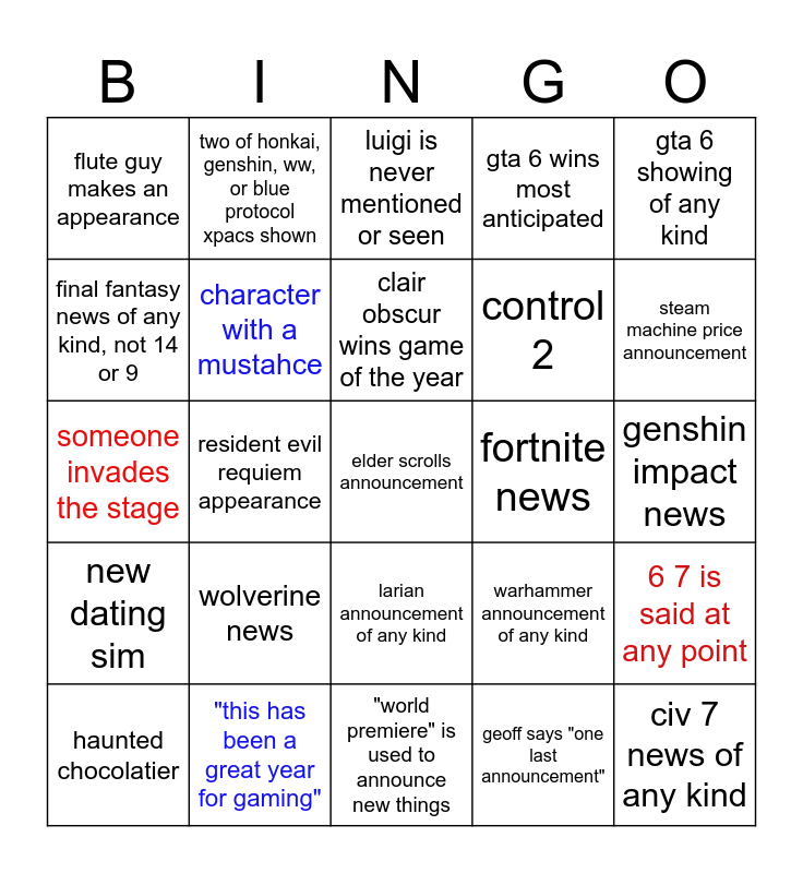 This bingo card has a free space and 24 words: wolverine news, "this has been a great year for gaming", clair obscur wins game of the year, haunted chocolatier, gta 6 showing of any kind, flute guy makes an appearance, final fantasy news of any kind, not 14 or 9, two of honkai, genshin, ww, or blue protocol xpacs shown, fortnite news, larian announcement of any kind, control 2, someone invades the stage, warhammer announcement of any kind, 6 7 is said at any point, character with a mustahce, geoff says "one last announcement", genshin impact news, luigi is never mentioned or seen, steam machine price announcement, resident evil requiem appearance, civ 7 news of any kind, new dating sim, gta 6 wins most anticipated and "world premiere" is used to announce new things.