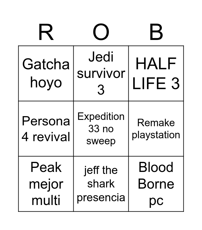 This bingo card has a free space and 8 words: Remake playstation, HALF LIFE 3, Jedi survivor 3, Peak mejor multi, Gatcha hoyo, Blood Borne pc, Persona 4 revival and jeff the shark presencia.