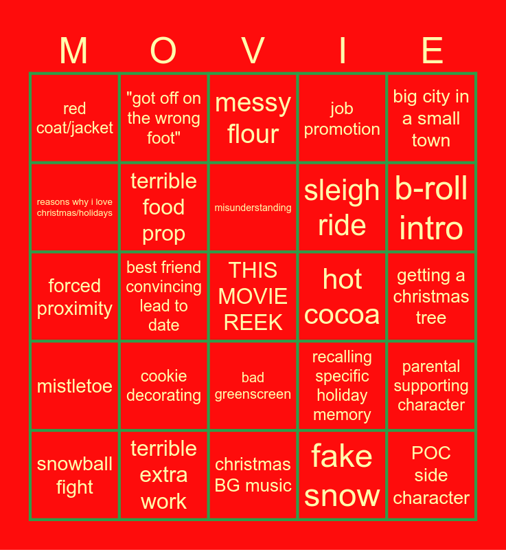 This bingo card has a free space and 51 words: dead relative/partner, POC side character, new in town, christmas BG music, cookie decorating, tree decorating, "got off on the wrong foot", breakup, reasons why i love christmas/holidays, niche tradition, terrible food prop, job promotion, parental supporting character, recalling specific holiday memory, interrupted kiss, bad weather, misunderstanding, hot cocoa, gingerbread house, big city in a small town, best friend convincing lead to date, fake snow, red coat/jacket, sleigh ride, santa claus, montage, b-roll intro, matchmaker, snowball fight, messy flour, interrupted by phone call, santa hat, change of plans, pun, weird interactions w/ extras, terrible extra work, 2 people physically bump into each other, planner/event organizing, holiday/winter-esque town name, grinch/scrooge attitude, getting a christmas tree, mistletoe, single parent, family/small business, bad laugh, "hey they're cute", forced proximity, meaning of christmas, open coat, bad greenscreen and kiss is the last scene.