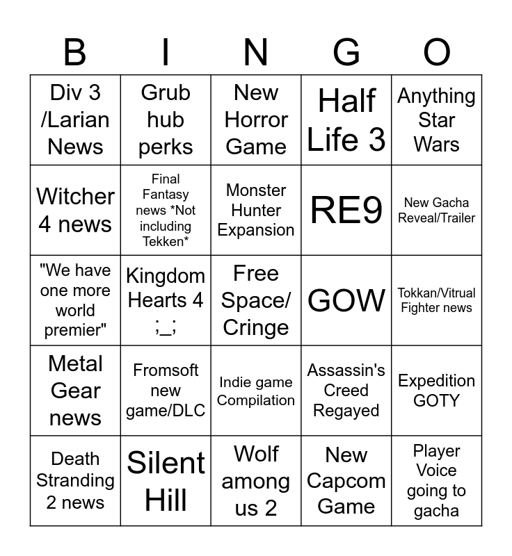 This bingo card has a free space and 24 words: Fromsoft new game/DLC, Silent Hill, Monster Hunter Expansion, Death Stranding 2 news, Anything Star Wars, Div 3 /Larian News, Witcher 4 news, Grub hub perks, GOW, Indie game Compilation, RE9, "We have one more world premier", Assassin's Creed Regayed, Expedition GOTY, Final Fantasy news *Not including Tekken*, New Capcom Game, Tokkan/Vitrual Fighter news, New Horror Game, New Gacha Reveal/Trailer, Kingdom Hearts 4 ;_;, Player Voice going to gacha, Metal Gear news, Half Life 3 and Wolf among us 2.