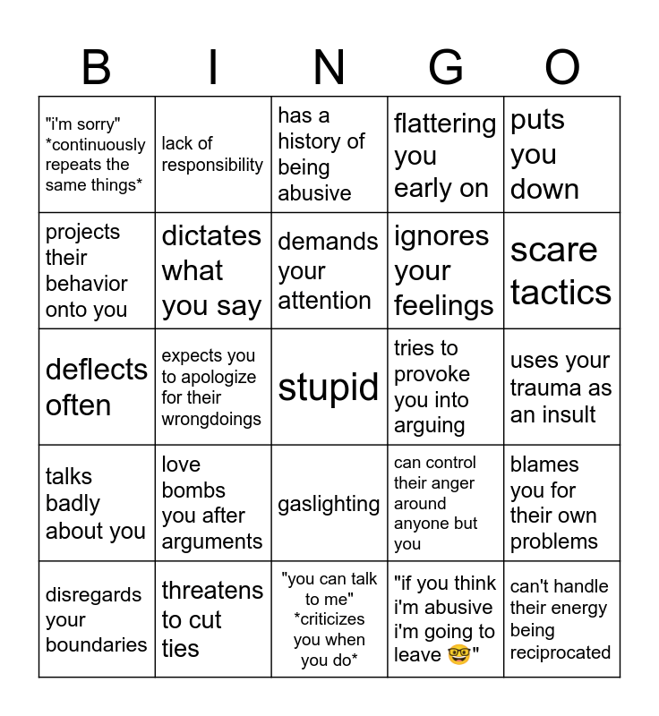 This bingo card has a free space and 24 words: love bombs you after arguments, threatens to cut ties, demands your attention, disregards your boundaries, puts you down, "i'm sorry" *continuously repeats the same things*, projects their behavior onto you, lack of responsibility, tries to provoke you into arguing, gaslighting, ignores your feelings, deflects often, can control their anger around anyone but you, blames you for their own problems, dictates what you say, "if you think i'm abusive i'm going to leave 🤓", uses your trauma as an insult, has a history of being abusive, scare tactics, expects you to apologize for their wrongdoings, can't handle their energy being reciprocated, talks badly about you, flattering you early on and "you can talk to me" *criticizes you when you do*.