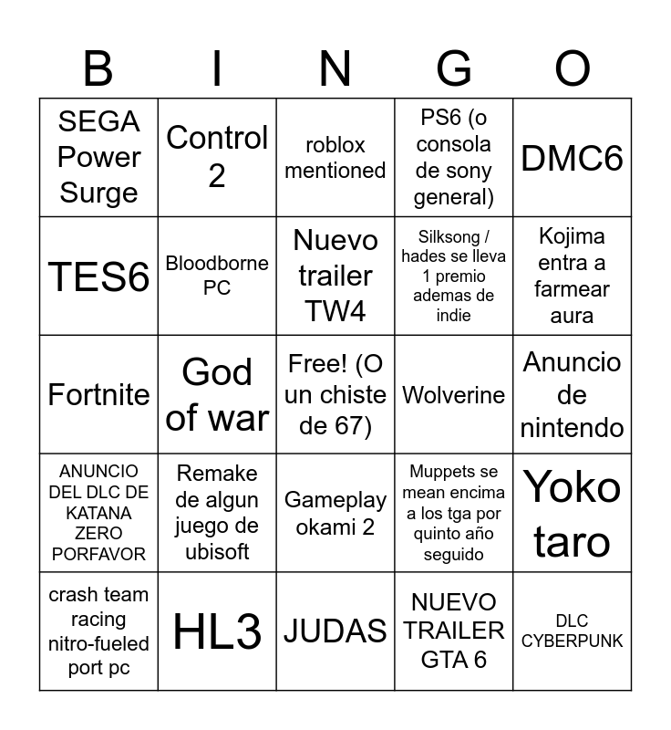 This bingo card has a free space and 24 words: Remake de algun juego de ubisoft, HL3, Nuevo trailer TW4, crash team racing nitro-fueled port pc, DMC6, SEGA Power Surge, TES6, Control 2, Wolverine, Gameplay okami 2, Silksong / hades se lleva 1 premio ademas de indie, Fortnite, Muppets se mean encima a los tga por quinto año seguido, Yoko taro, Bloodborne PC, NUEVO TRAILER GTA 6, Anuncio de nintendo, roblox mentioned, Kojima entra a farmear aura, God of war, DLC CYBERPUNK, ANUNCIO DEL DLC DE KATANA ZERO PORFAVOR, PS6 (o consola de sony general) and JUDAS.