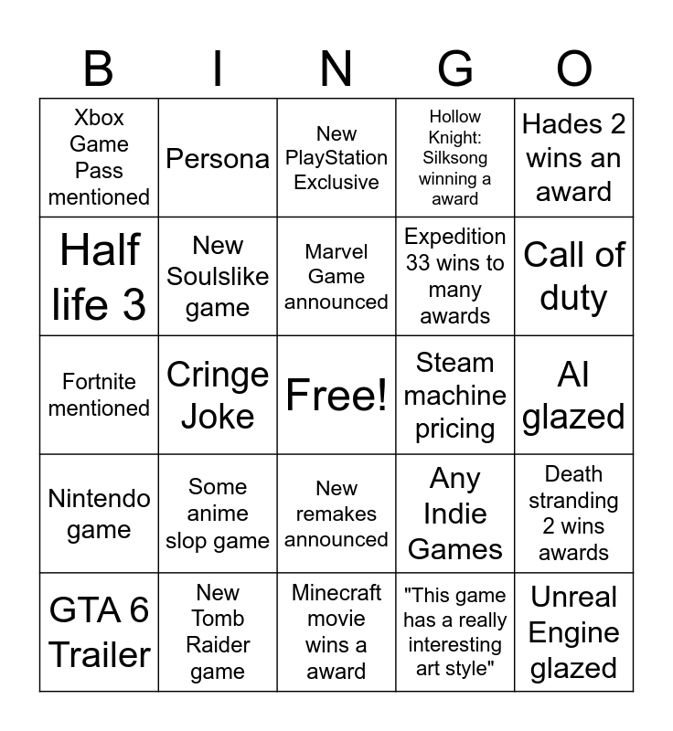 This bingo card has a free space and 24 words: Some anime slop game, New Tomb Raider game, Marvel Game announced, GTA 6 Trailer, Hades 2 wins an award, Xbox Game Pass mentioned, Half life 3, Persona, Steam machine pricing, New remakes announced, Expedition 33 wins to many awards, Fortnite mentioned, Any Indie Games, Death stranding 2 wins awards, New Soulslike game, "This game has a really interesting art style", AI glazed, New PlayStation Exclusive, Call of duty, Cringe Joke, Unreal Engine glazed, Nintendo game, Hollow Knight: Silksong winning a award and Minecraft movie wins a award.