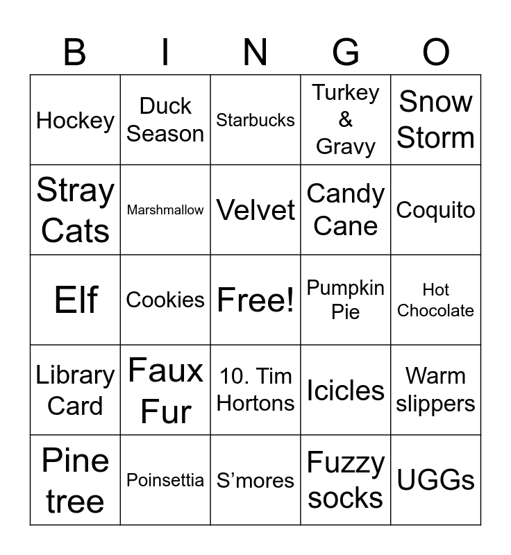 This bingo card has a free space and 42 words: Cashmere, Velvet, Leather, Faux Fur, Fuzzy socks, Warm slippers, UGGs, Dunkin, Starbucks, 10. Tim Hortons, Hot Chocolate, Coquito, Cookies, Snow Storm, Frozen Lake, Icicles, Reindeer, Elf, Gnome, Duck Season, Stray Cats, Shelter Dogs, Ice Skating, Hockey, Football, Spaghetti, Candy Cane, Mittens, Beanie, Scarf, Class VI, Library Card, Marshmallow, S’mores, Decorating, Pine tree, Poinsettia, Pumpkin Pie, Flan, Cheesecake, Turkey & Gravy and Polar Express.