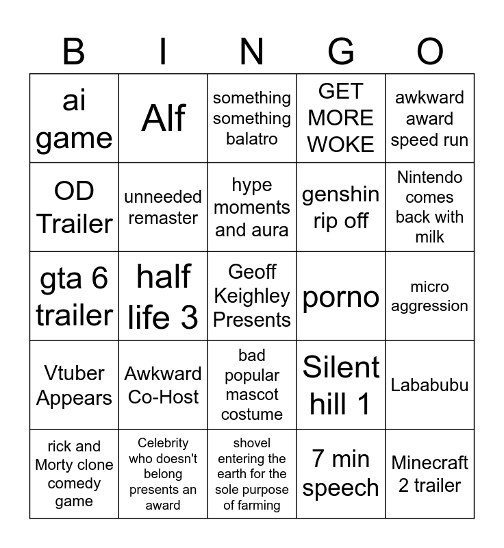 This bingo card has a free space and 24 words: Awkward Co-Host, Celebrity who doesn't belong presents an award, hype moments and aura, rick and Morty clone comedy game, awkward award speed run, ai game, OD Trailer, Alf, porno, bad popular mascot costume, genshin rip off, gta 6 trailer, Silent hill 1, Lababubu, unneeded remaster, 7 min speech, micro aggression, something something balatro, Nintendo comes back with milk, half life 3, Minecraft 2 trailer, Vtuber Appears, GET MORE WOKE and shovel entering the earth for the sole purpose of farming.