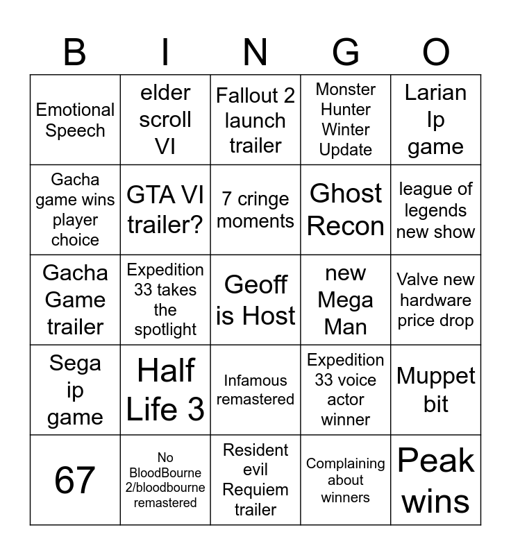 This bingo card has a free space and 24 words: Half Life 3, No BloodBourne 2/bloodbourne remastered, 7 cringe moments, 67, Larian Ip game, Emotional Speech, Gacha game wins player choice, elder scroll VI, new Mega Man, Infamous remastered, Ghost Recon, Gacha Game trailer, Expedition 33 voice actor winner, Muppet bit, GTA VI trailer?, Complaining about winners, Valve new hardware price drop, Fallout 2 launch trailer, league of legends new show, Expedition 33 takes the spotlight, Peak wins, Sega ip game, Monster Hunter Winter Update and Resident evil Requiem trailer.